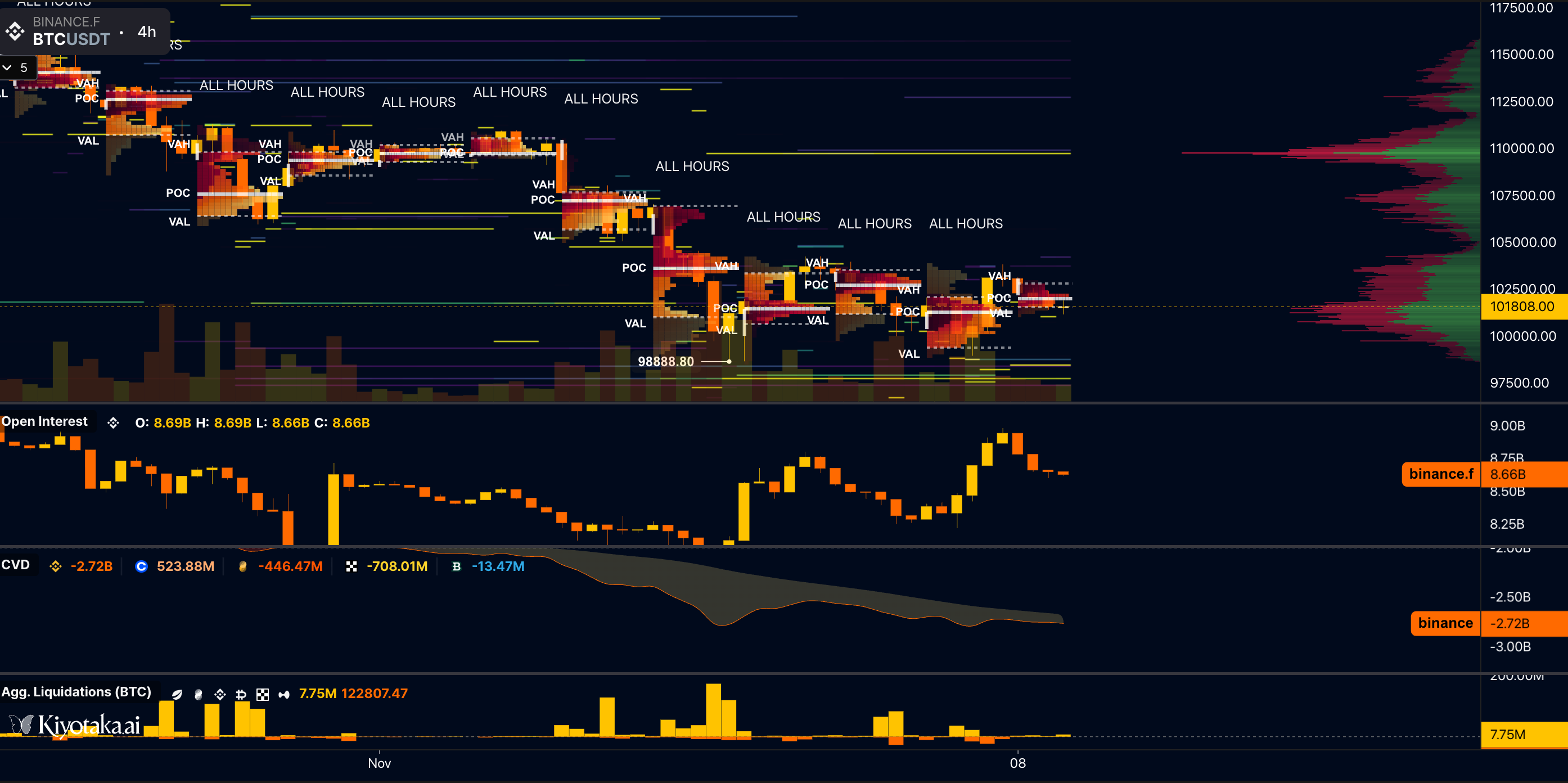 - Locally, we're seeing open interest coming in at the low, but mostly from shorts building up, which may give us an edge towards a short squeeze; however, price must break above 104K to squeeze shorts. We're also seeing not much more of a push up in terms of Spot CVD, so we're not seeing large participants step into new long positions just yet.